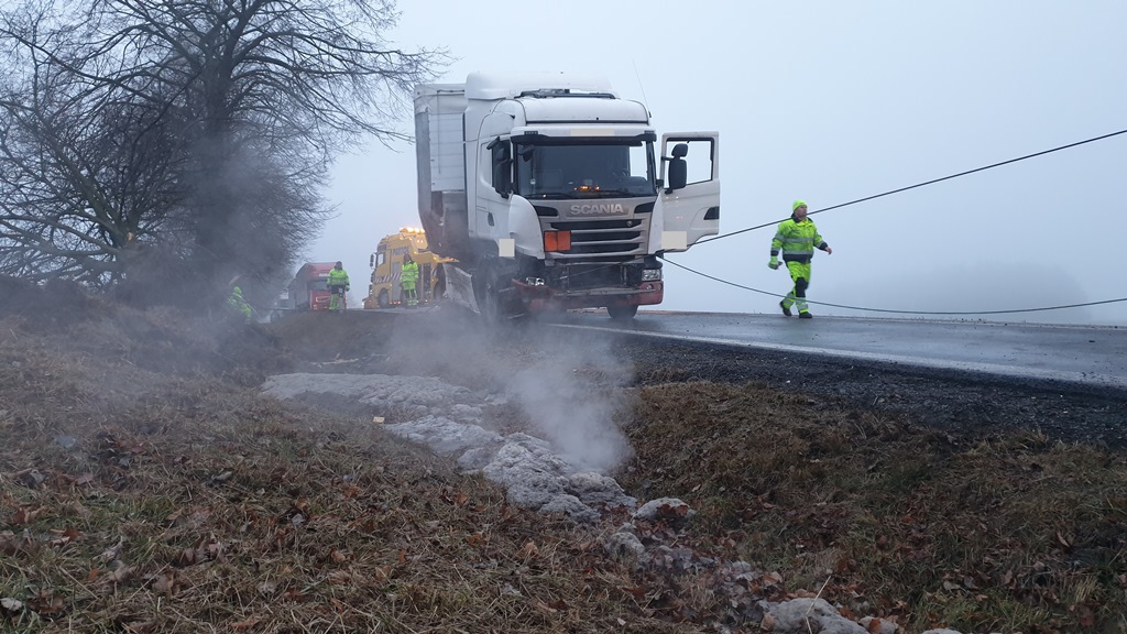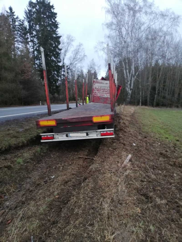 Nákladní vozidlo Scania s návěsem pro přepravu dřeva jedoucí ve směru na Tábor havarovalo za odbočkou na Dubovice před devátou hodinou dopolední. „Vozidlo jsme vyprošťovali vyprošťovacím jeřábem Tatra a vyprošťovacím speciálem MAN. Následně jsme provedli odtah na místo určené majitelem vozidla,“ řekl Endrle. Zásah byl ukončen po jedenácté hodině dopolední.