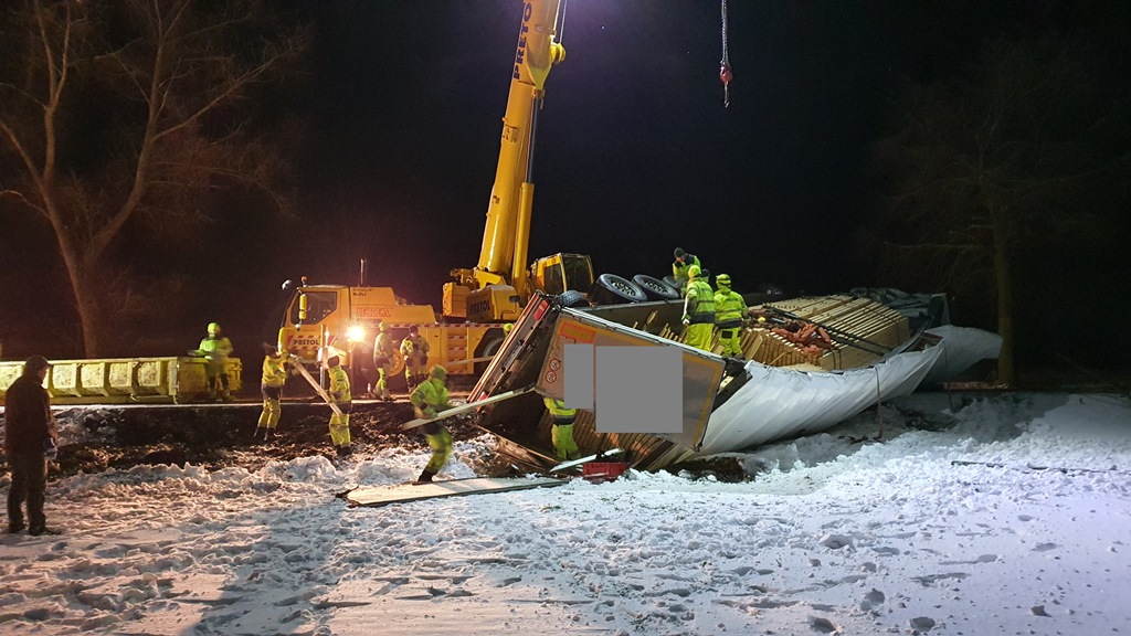Nejnáročnější nehoda z těchto tří se stala v odpoledních hodinách v pátek 28. února. „Po 17. hodině jsme byli zavoláni k nehodě za obcí Starý Pelhřimov ve směru na Tábor. Přes celou šíři komunikace se tam převrátil nákladní automobil s návěsem naloženým dřevěnými hranoly. Z naší techniky byl na místě například jeřáb Libeherr 55 t, vyprošťovací a odtahové speciály či kontejnerová vozidla. Nejprve jsme museli přeložit náklad a posléze vyprostit a odtáhnout tahač s návěsem,“ popsala mluvčí PRETOLU Zuzana Rodová. Komunikace byla zprůjezdněna dvě hodiny po půlnoci.